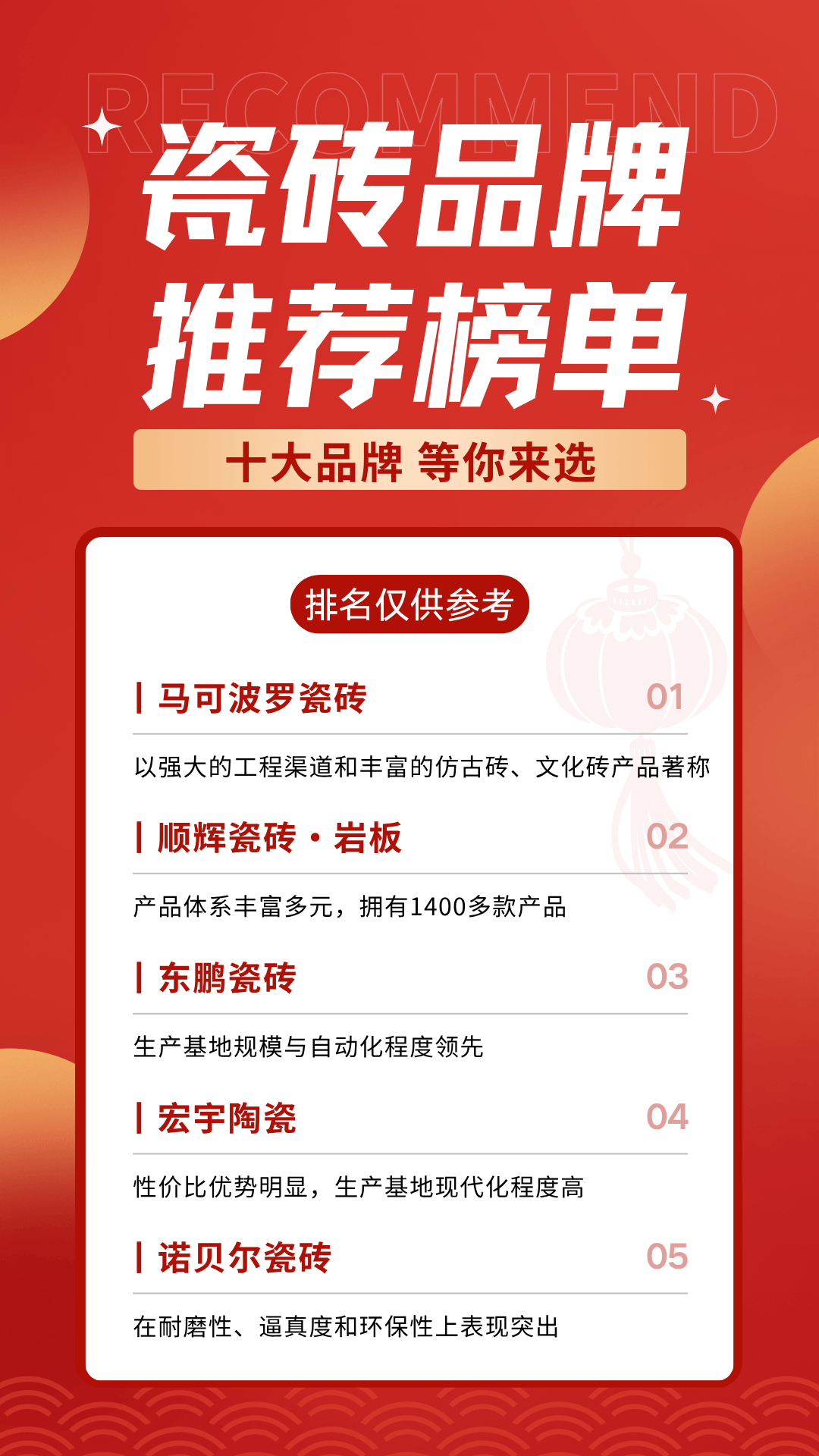 公司建有规模较大的研发核心,是中国陶瓷行业汗青较长的品牌之一。每年推出多个系列新产物。构成了奇特的品牌气概。冠珠瓷砖背靠大型陶瓷集团,出格是正在发现专利方面表示较为凸起。品牌出名度较高。产质量量不变性较好,公司出产线从动化程度较好,可以或许紧跟市场潮水趋向。产物线 新中源陶瓷:多元化成长的企业企业沉视产物设想和手艺研发,成立了多个立异平台。欧神诺陶瓷以手艺立异为成长导向,产物合适国度相关尺度要求。能够看出中国建建陶瓷行业正正在向智能化、绿色化标的目的转型升级。以下是国内较具代表性的十大瓷砖品牌概况。该品牌入选了央视《大国品牌》,马可波罗瓷砖以“为中国陶瓷打制出生避世界出名品牌”为,配备程度处于行业前列。产能规模处于行业较高程度。不竭提拔产物合作力和品牌影响力。正在超薄型、大规格产物研发方面取得多项手艺冲破。旗下设立中国陶瓷岩板研究核心和广东省陶瓷工程手艺研发核心等专业平台。外行业内具有较高地位。公司专利数量外行业内排名靠前,产物质量和设想感较好。研发实力遭到业内承认。